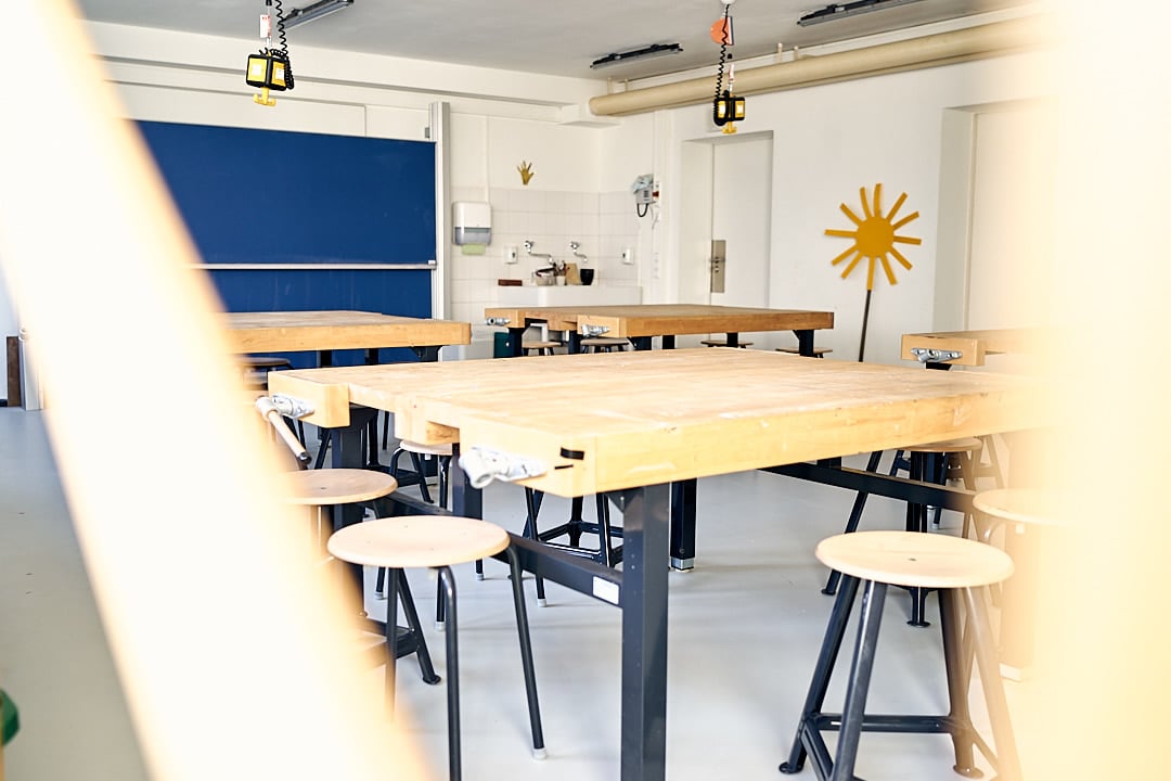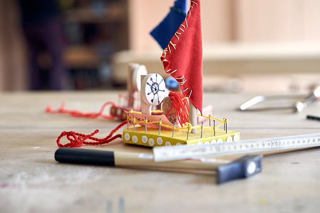 Die Kreativ-Werkstatt kann zum Werken, Basteln, Erfinden und Gestalten genutzt werden. Hier finden die Kinder ganz unterschiedliche Materialien, um beispielsweise Raumschiffe aus Pappe oder Tiere aus Ton zu gestalten. Im dazugehörigen Ofen können die Tonfiguren außerdem gebrannt werden.