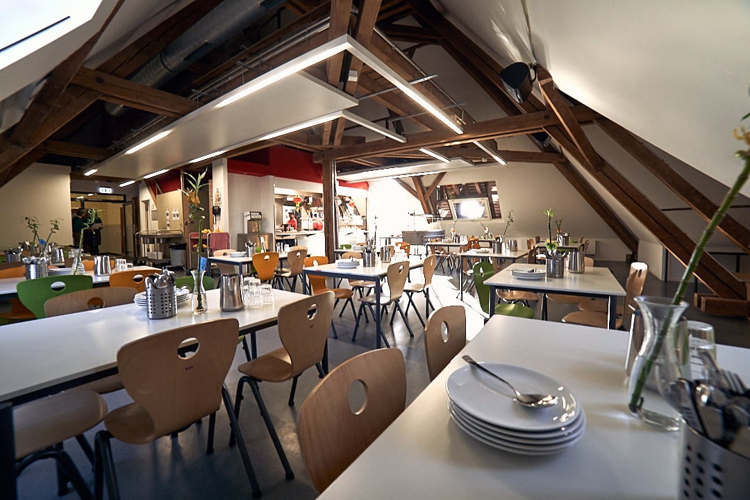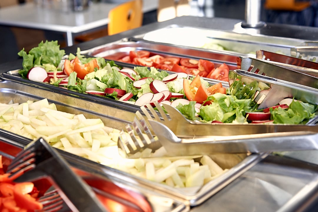 In unserer Mensaküche wird das von unserem Caterer im Cook and Chill-Verfahren zubereitete Essen fertig gekocht und der Salat und das Gemüse für die Salatbar täglich frisch zubereitet.