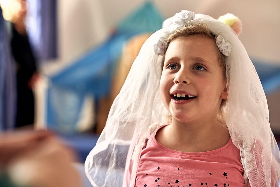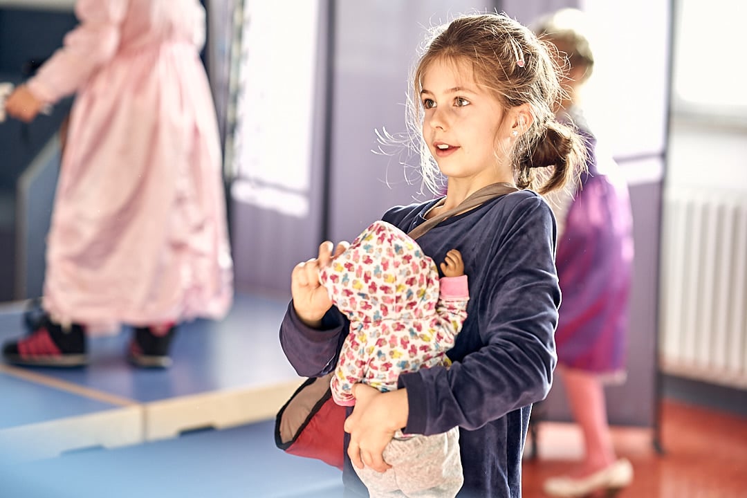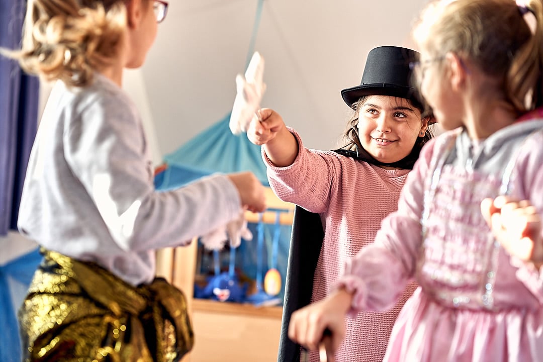 Im Rollenspielraum können die Kinder ihrer Kreativität freien Lauf lassen und durch vielfältige Requisiten in unterschiedliche Rollen schlüpfen.