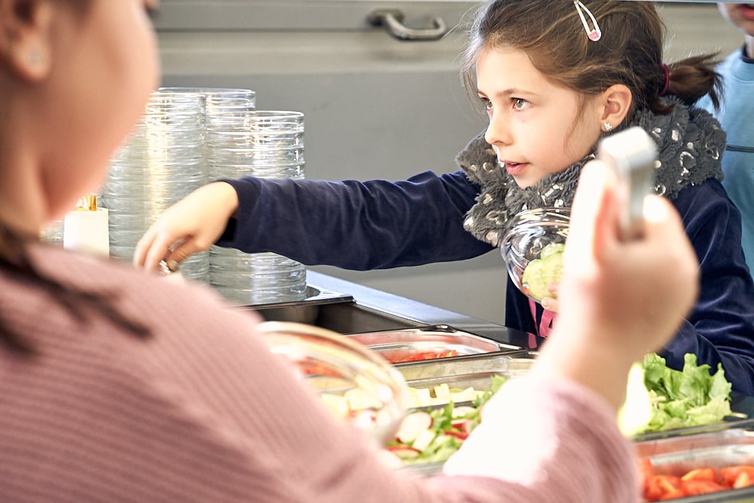 In unserer Mensa essen die Kinder in zwei Schichten zu Mittag.
