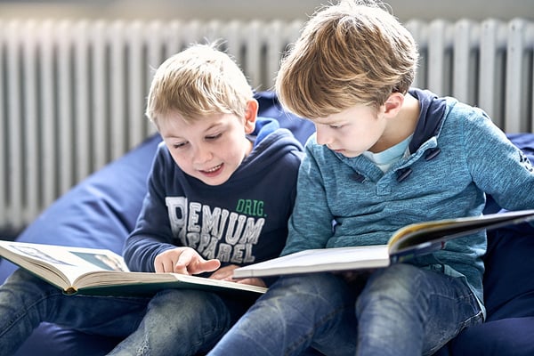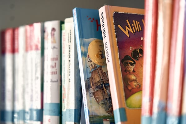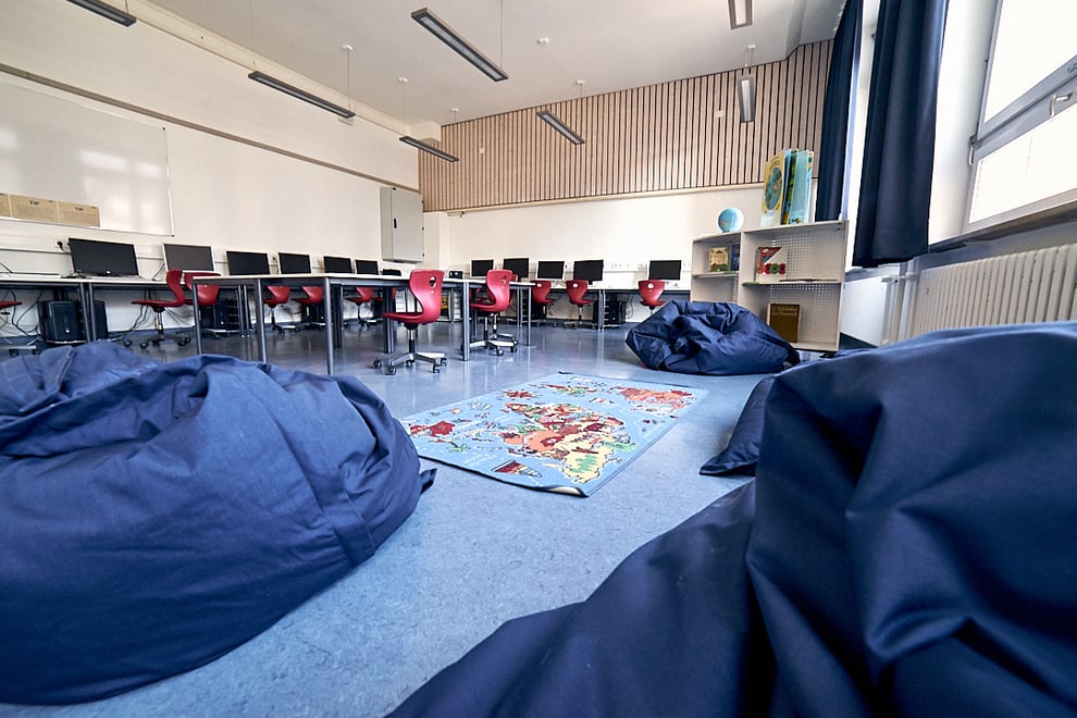 Im Medienraum befindet sich auch unsere Schulbücherei, in der Bücher und Hörbücher ausgeliehen werden können. Diese können auch während des Mittagsbandes auf den Sitzsäcken gemütlich gelesen oder angehört werden.