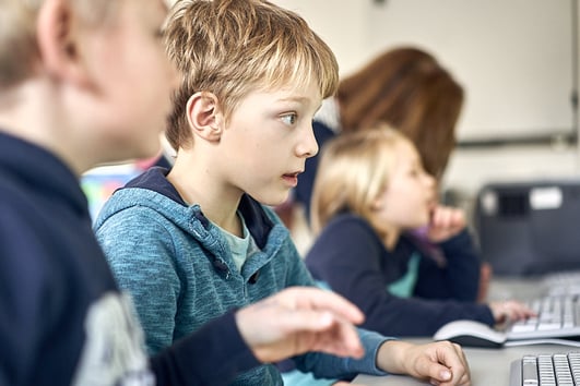 Im Medienraum können die Kinder erste Erfahrungen am Computer sammeln. Während des Unterrichts können die Klassen hier recherchieren oder Lernprogramme nutzen. Mit Hilfe des Beamers können auch Filme gezeigt werden oder die Funktion von Computerprogrammen anschaulich erklärt werden.